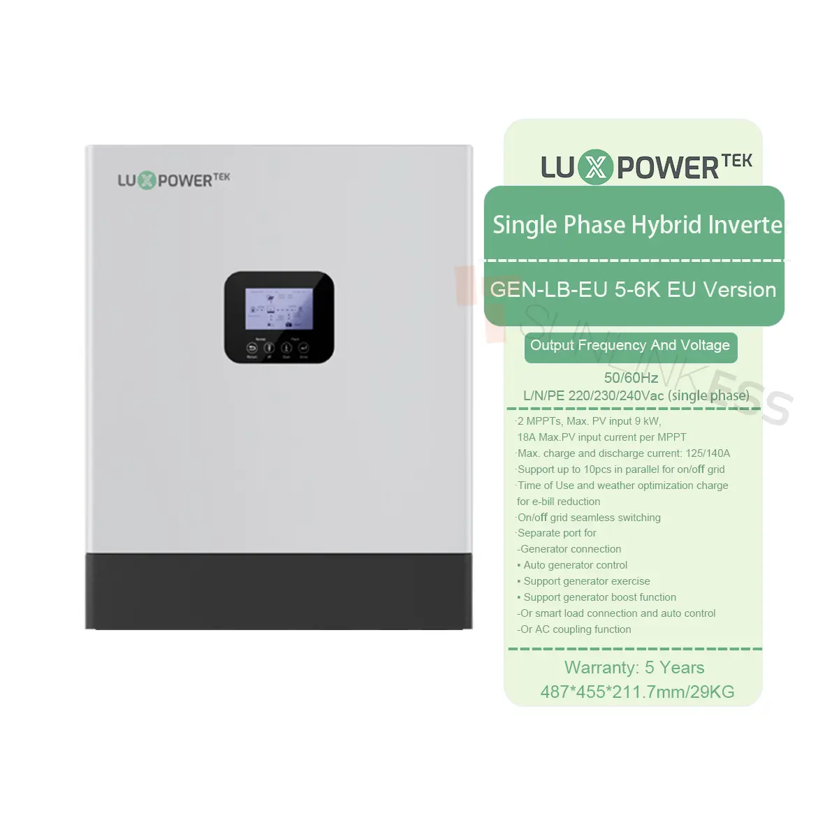Sunlink는 비용 효율적이고 신뢰할 수있는 태양 솔루션을 찾는 태양 애호가를 위해 설계된 고급 하이브리드 단일 상 인버터 인 Luxpower Gen-LB-EU 5-6K 시리즈를 소개합니다. 문의를 환영합니다!