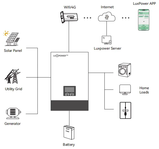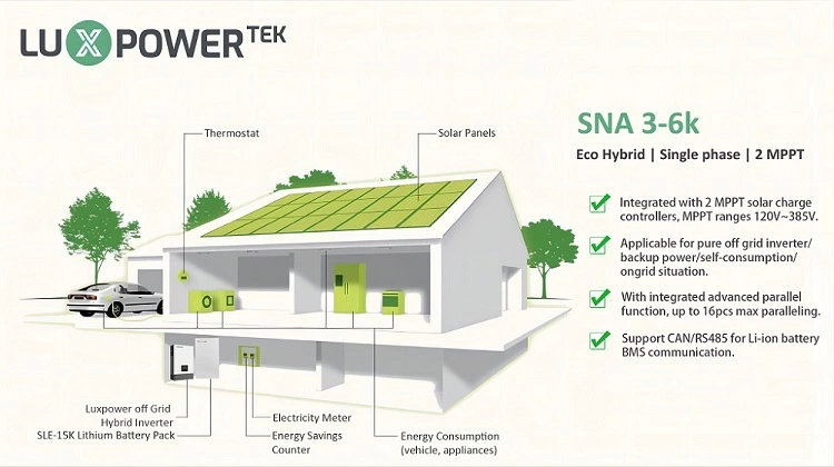 Sunlink의 Luxpower SNA 6000은 그리드에 연결된지 여부에 관계없이 집의 중단없는 전력을 보장합니다.